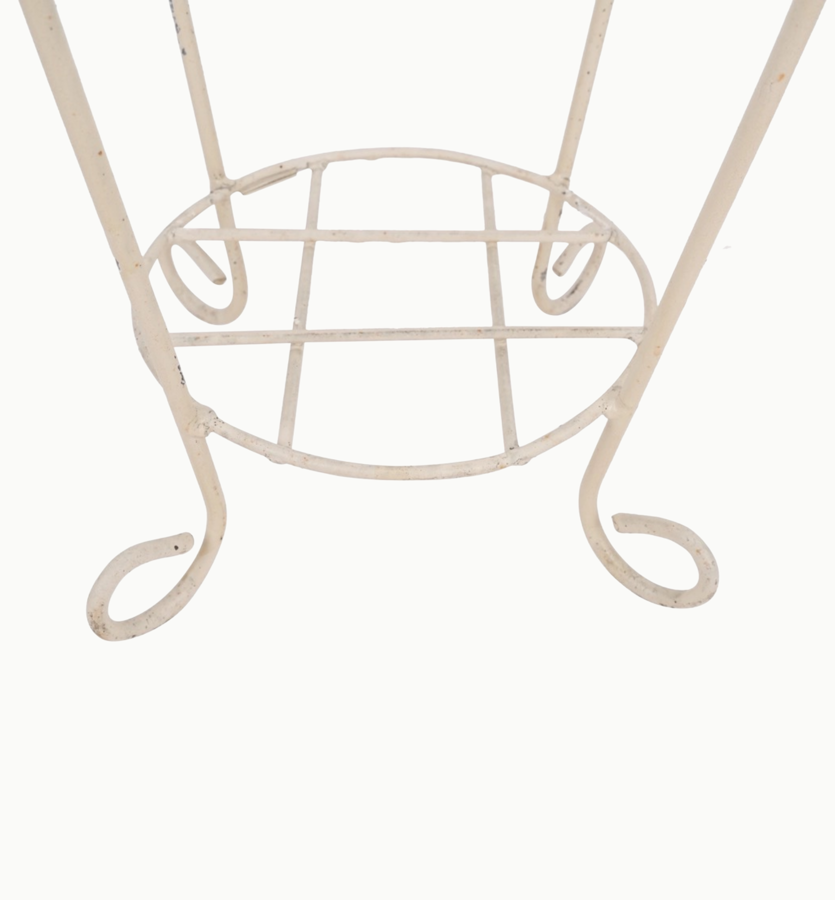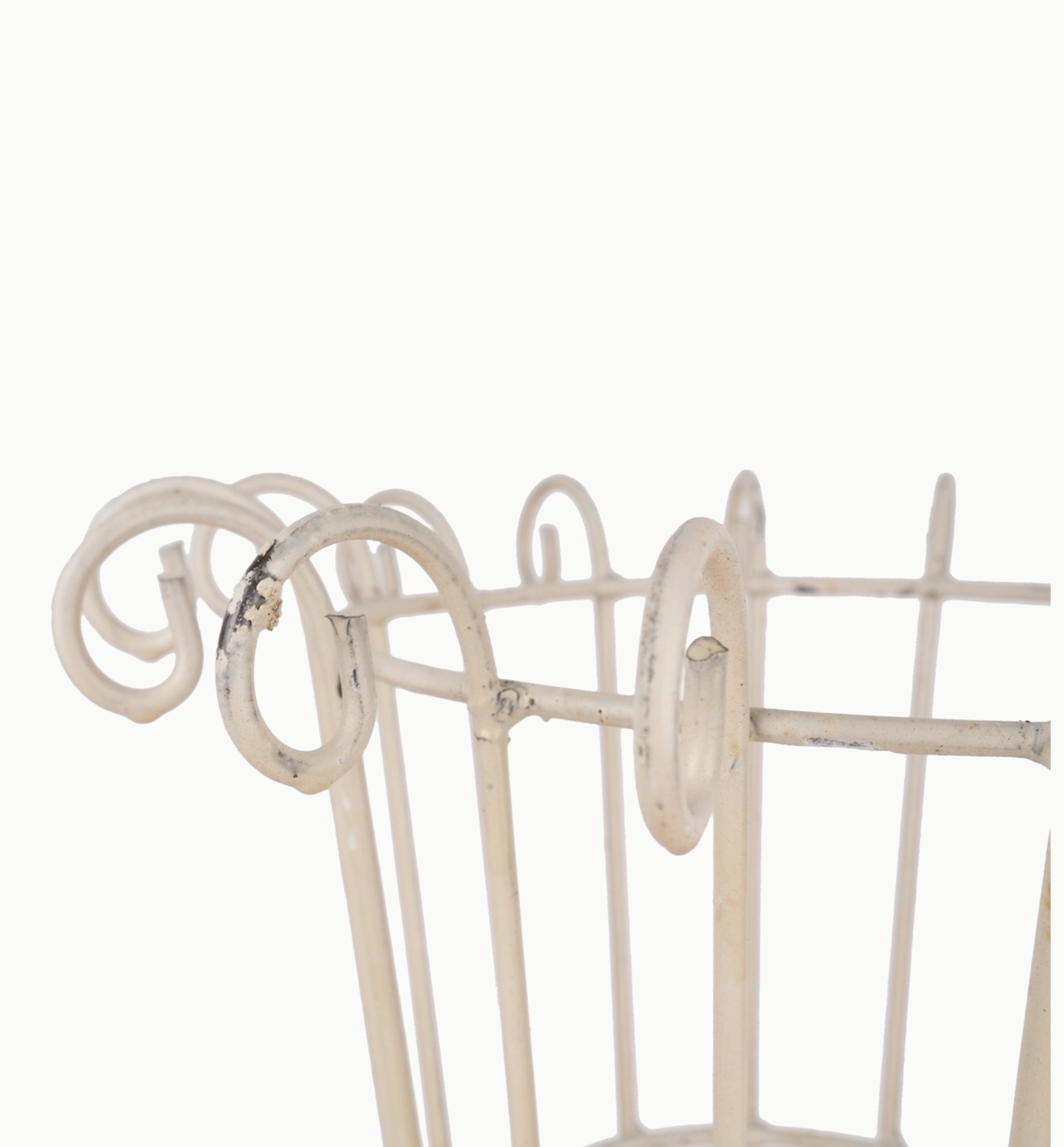The piece is finished in a rustic white paint with subtle distressing that reveals hints of metal and warm rust tones beneath offering a timeworn feel.