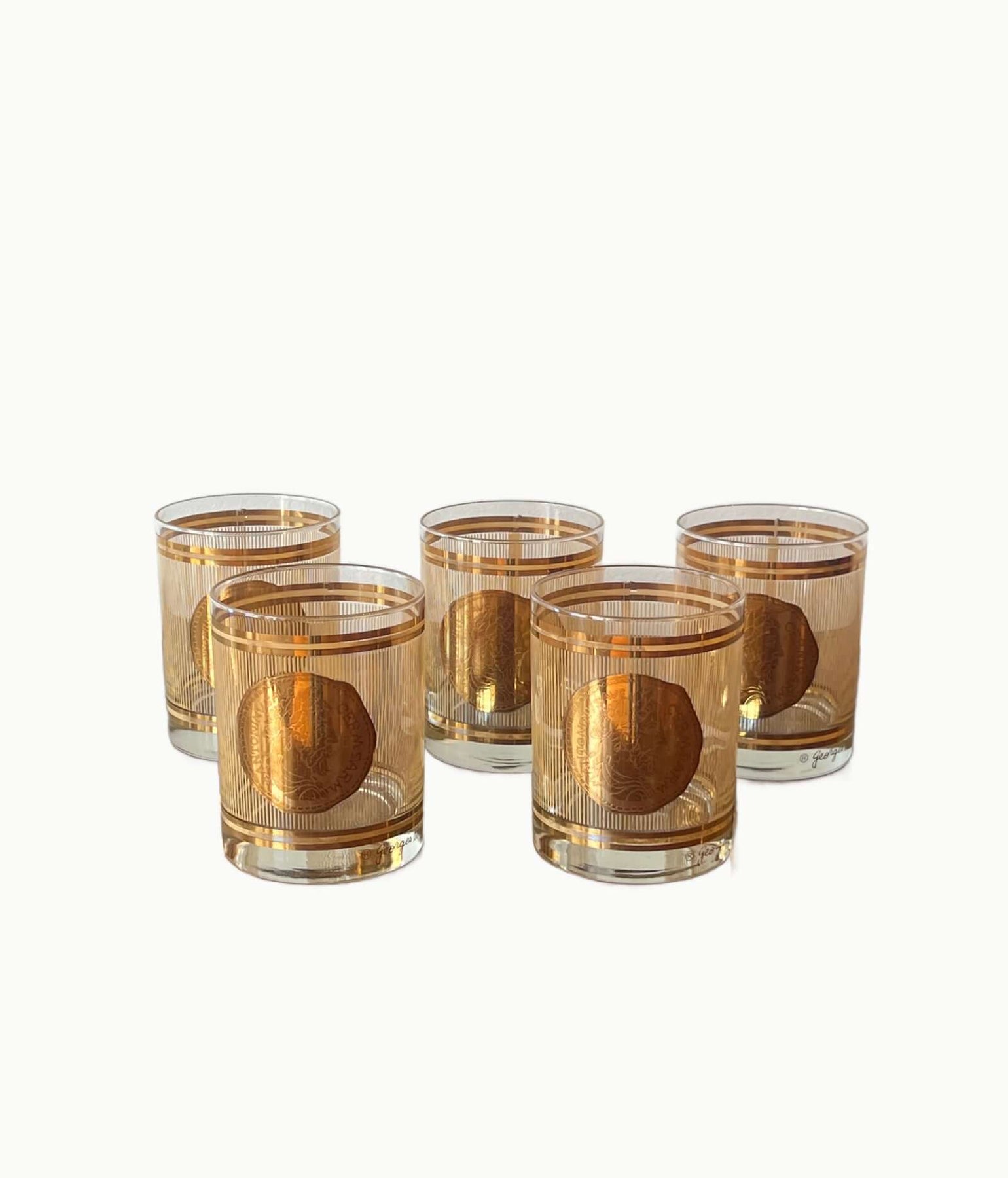 This pattern was one of Briard’s classic luxury barware lines from the 1960s, sold through department stores such as Neiman Marcus and Bloomingdale’s. The combination of ribbed glass, ancient-coin motif, and rich gold detailing gives these a sophisticated, collectible appeal.