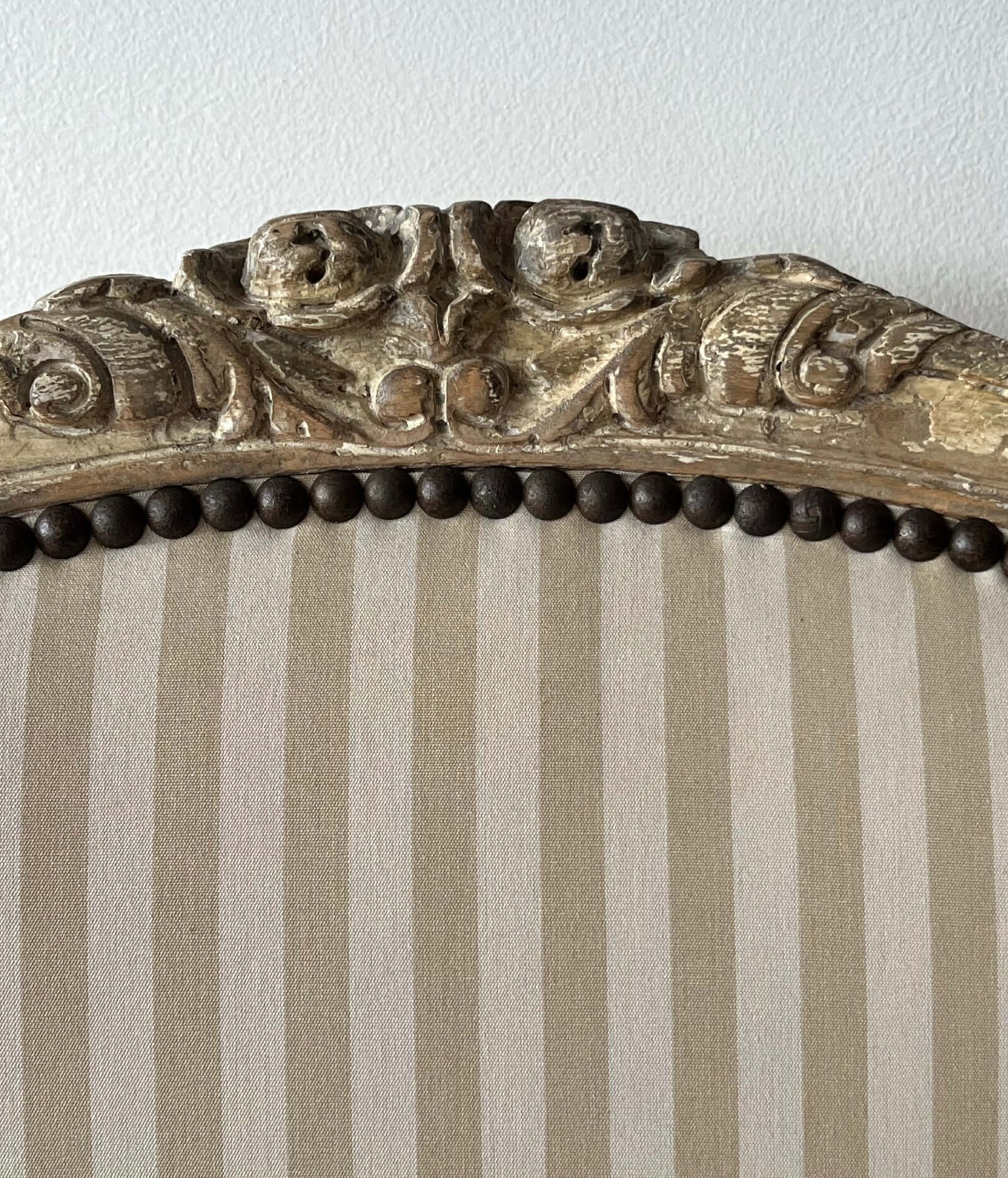 Close-up view of Pair of Vintage Louis XV Style Fateuil armchairs with distressed wood and striped upholstery.