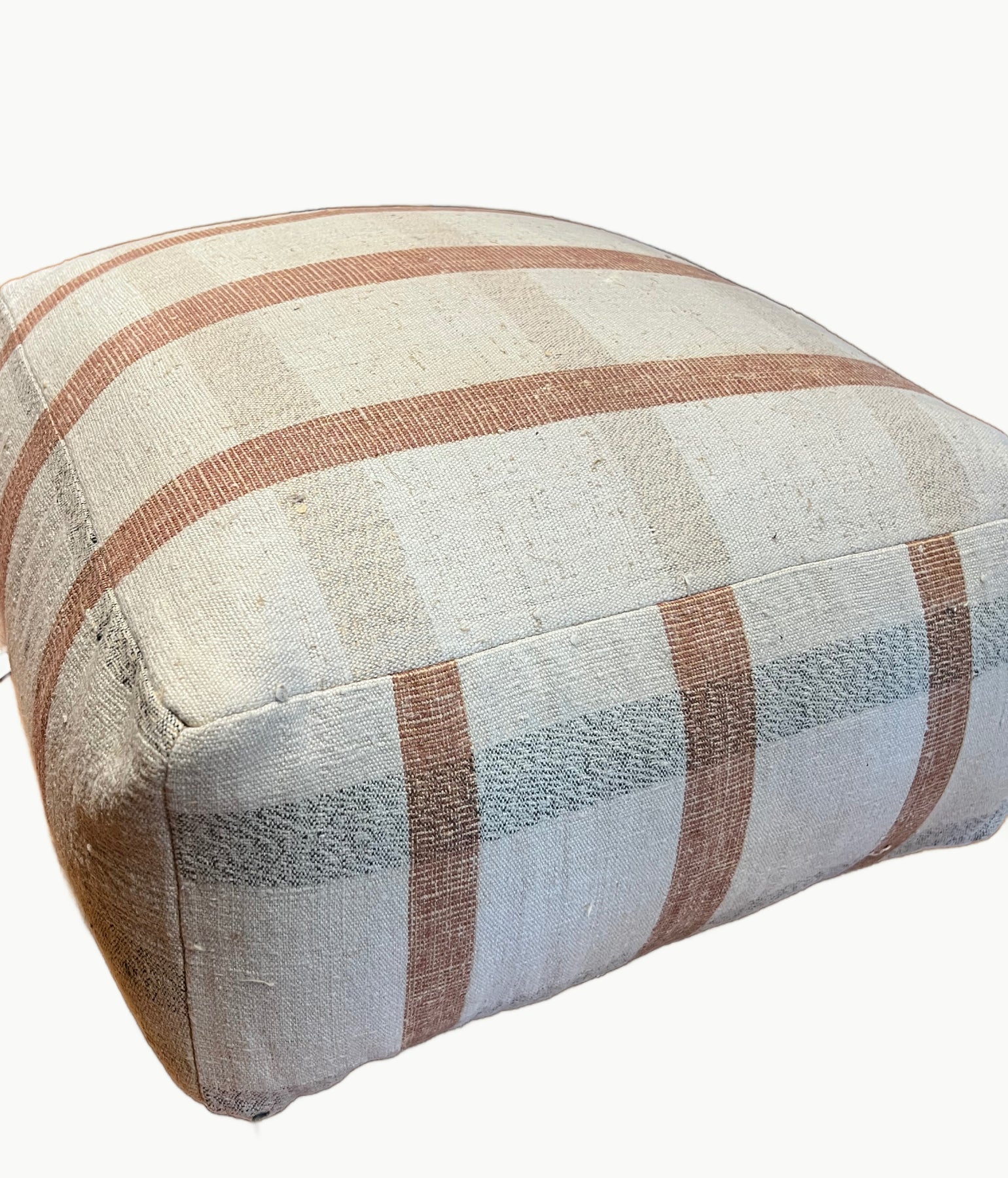 A hundred years ago, the meticulously handwoven textile used to make this floor cushion was originally a grain sack. The grain sacks were discovered in Miranda do Douro along the northeastern region of Portugal that borders Spain, the oldest border of Europe along the Douro River. What makes these grain sacks so unique are the vibrant, intentional colors the women chose to weave with. Typically grain sacks were woven in the natural color of the fiber. The fabric is a linen/wool blend and filld with cork. Pouf designed and fabricated by Studio Augustin.