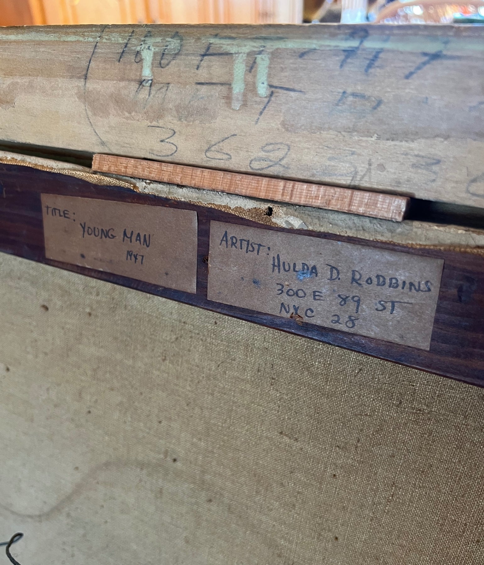 A vibrant mid-century oil painting titled, "Young Man" by artist H.D. Robbins of NYC, dated 1947. The piece features a stylized male figure set against abstract bands of sea, sand and sky with a bold yellow sun.