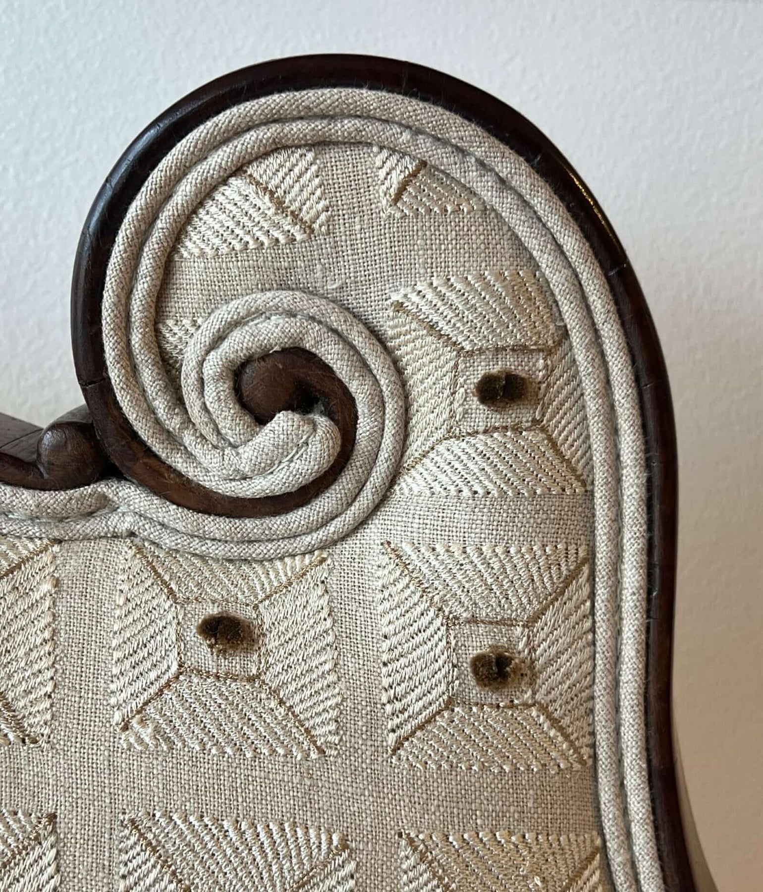 Detail of the Antique Scroll-Crest Upholstered Armchair in Mahagony Frame, showcasing the scroll design and upholstery.