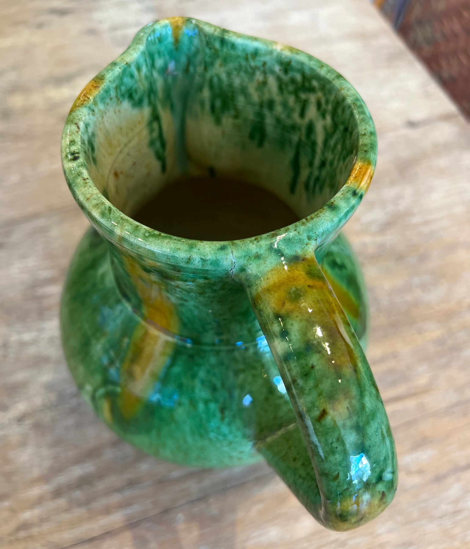 A lovely hand-thrown ceramic pitcher featuring layered green and ochre glaze with hints of iridescence, likely European in origin. The expressive drip-glaze finish and bold organic form reflect midcentury studio pottery aesthetics. Stands approximately 8” high with a wide bulbous body, pinched lip, and pulled handle. A beautiful decorative accent or functional serving piece.